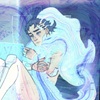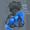 Description: A drawing of SecUnit curled up in a box watching a virtual screen, surrounded by a glowing cloud that represents ART, they are cuddling in an isolation box watching media together