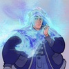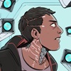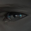 Description: A digital painting closeup of SecUnit's eye, it is blue and just barely visible on an arc around the iris is a company name logo