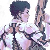 Description: SecUnit seen from behind wearing armor but no helmet, and holding a Really Big Gun