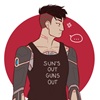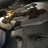 Description: A digital painting of SecUnit holding up one of its arm energy weapons, the weapon is extended, the arm is just above its eyes and all that is visible of its face is its eyes, the end of the weapon is glowing like it had just fired or is about to fire